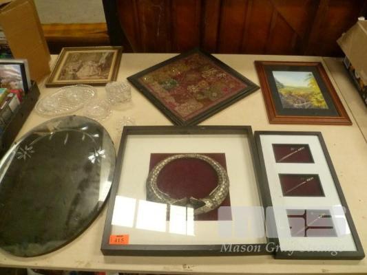 FRAMED WALL ART, ART DECO MIRROR, PRINT & GLASS WARE (1 X TABLE)