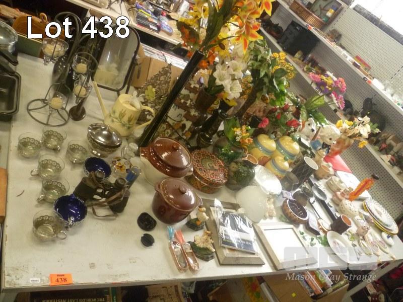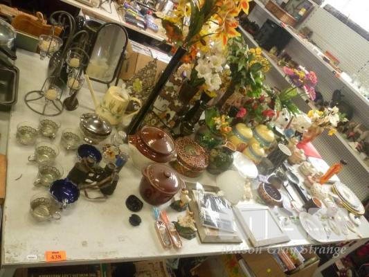 ASSORTED HOMEWARES INC VASES, ARTIFICIAL FLOWERS, DISPLAY PLATES, CANISTERS, ETC, 1 x TABLE