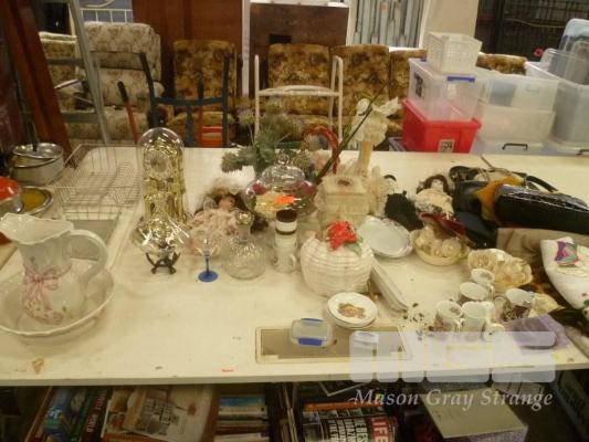 DOME CLOCK, VASES, HANDBAGS, PORCELAIN DOLLS, ETC