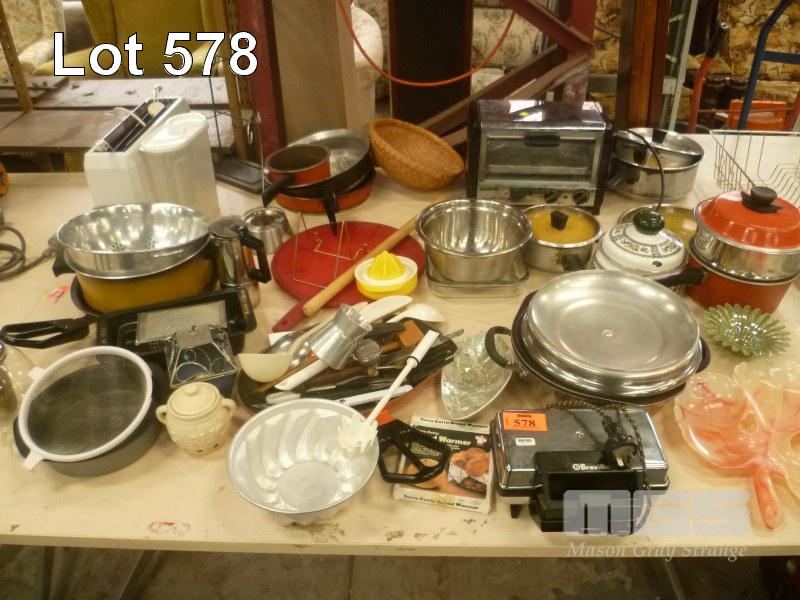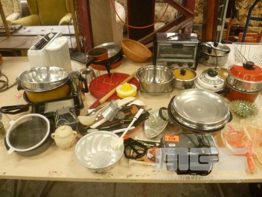 ASSORTED KITCHEN APPLIANCES, COOKWARE, UTENSILS, ETC, 1 x TABLE