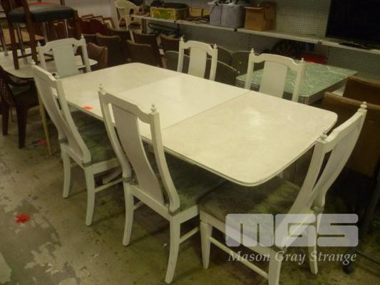 WHITE PAINTED TIMBER 7 PIECE DINING SUITE INC RECTANGULAR EXTENSION TABLE, BRASS CLAW FEET & 6 x DINING CHAIRS