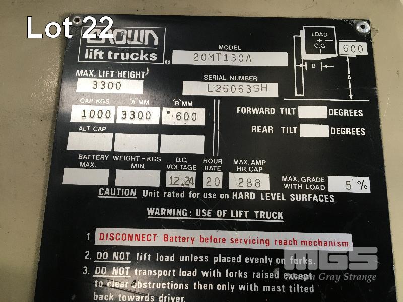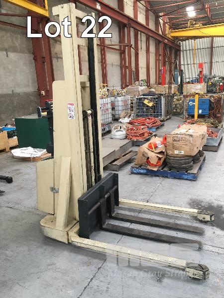 WALKIE STACKER, CROWN MOD: 201MT130A S/NO: L26063SH LIFT CAP: 1,000kg MAX LIFT HEIGHT: 3,300mm WIDTH ADJUSTABLE COUNTER BALANCE LEGS BUILT IN CHARGER, 240V