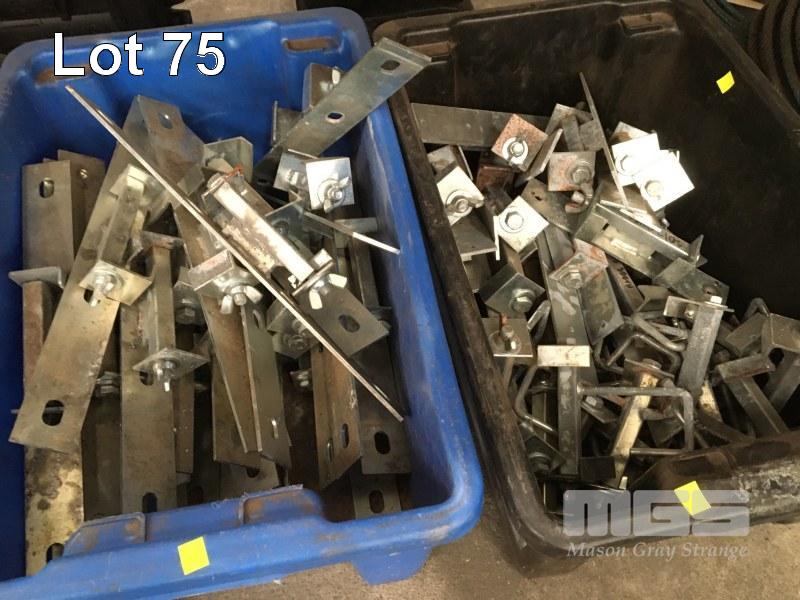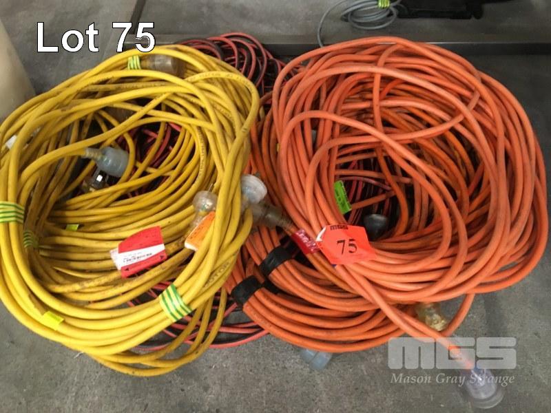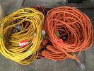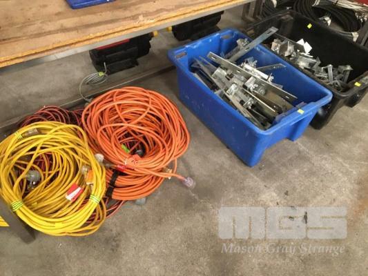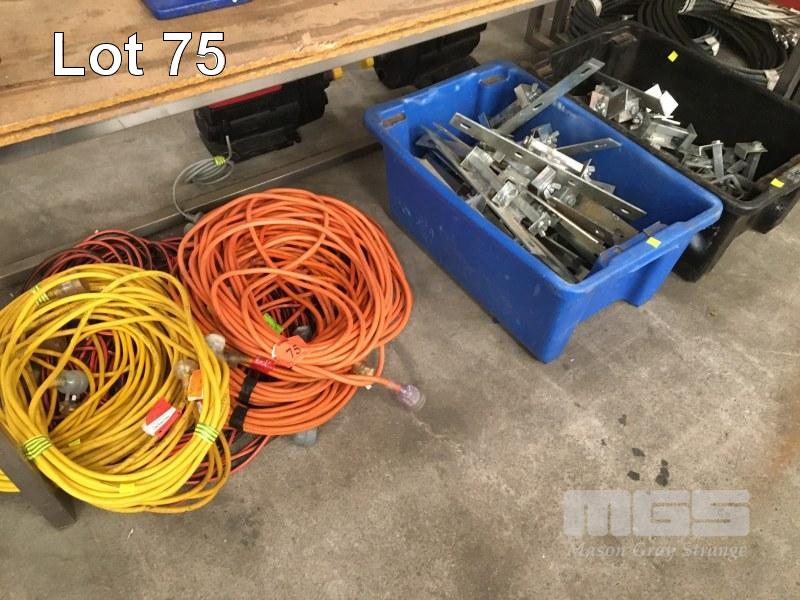 6 x 32-AMP EXTENSION CORDS & 2 x CRATES OF GALVANIZED ELECTRICAL CONDUIT MOUNTING BRACKETS