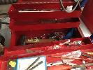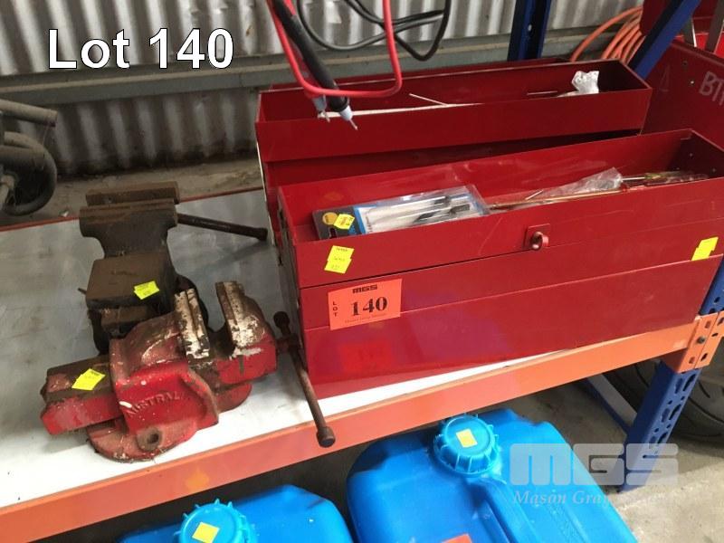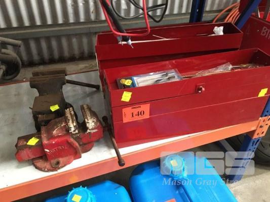 2 x VICES, 80 & 100mm, & CANTILEVER TOOL BOX & ASSORTED HAND TOOLS