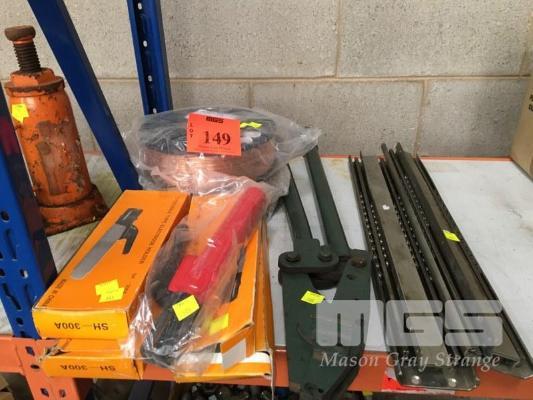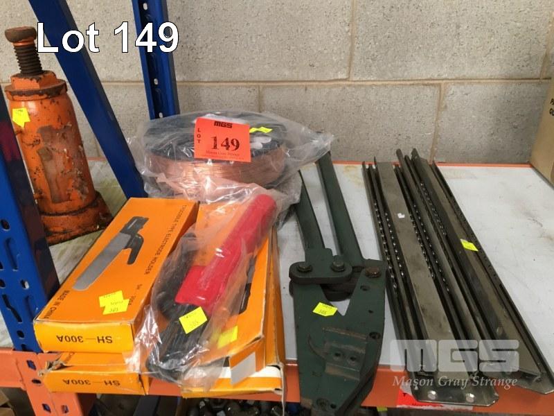4 x ARC WELDING ELECTRODE HOLDERS, 2 x ROLLS MIG WIRE FLUXOFIL 14HDS. NOTCHING TOOL & DRAWER SLIDES