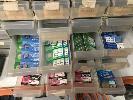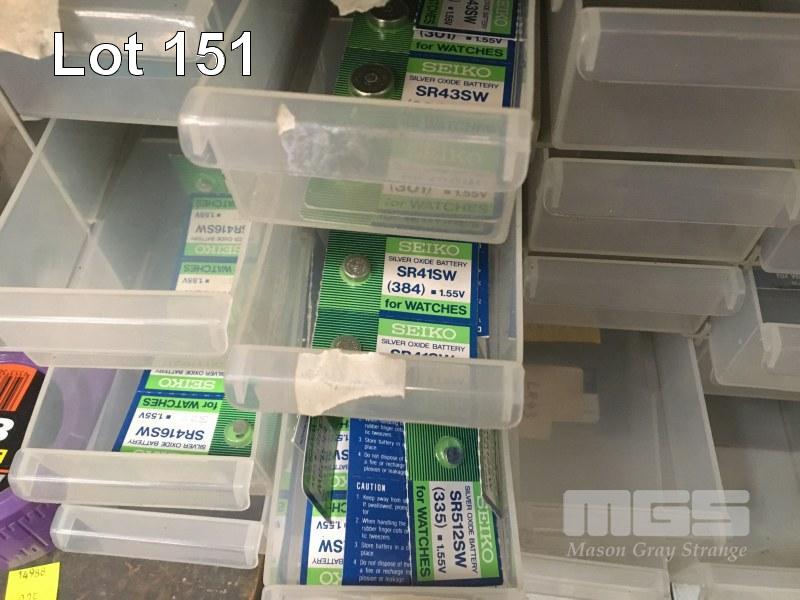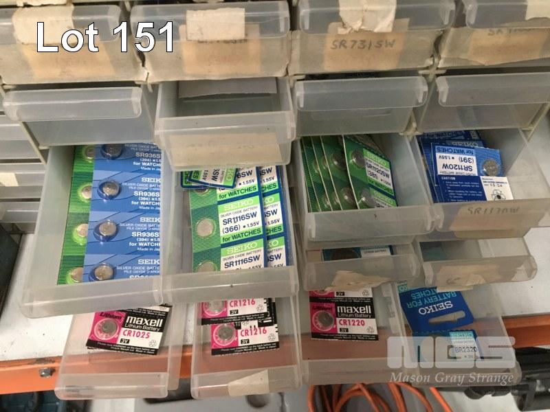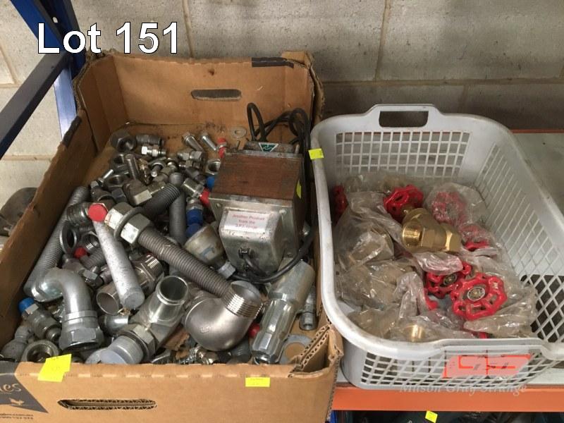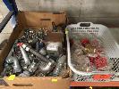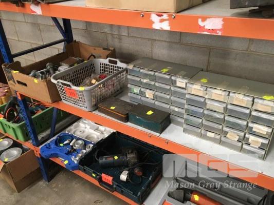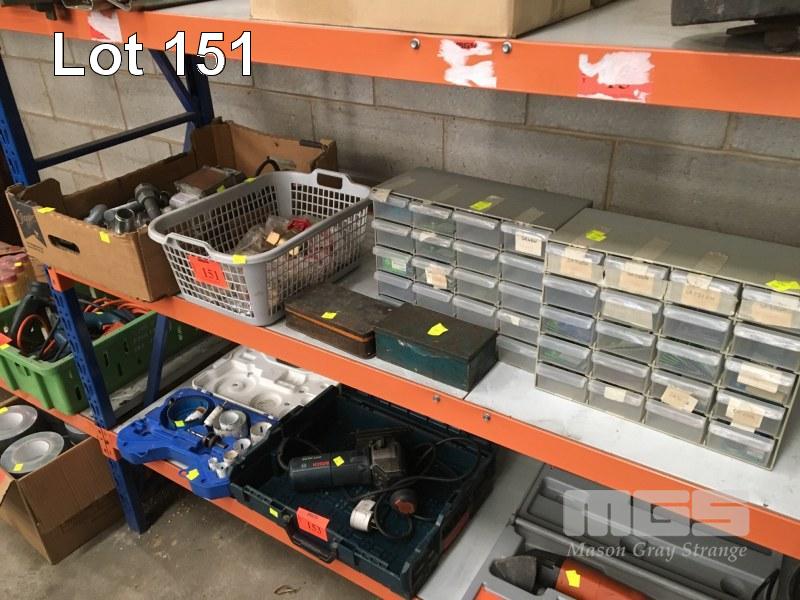2 x PARTS DRAWER UNITS WITH ASSORTED BUTTON BATTERIES, BRASS 1" VALVES, TRANSFORMER, FITTINGS, NUTS & BOLTS, ETC, 2 x BOXES