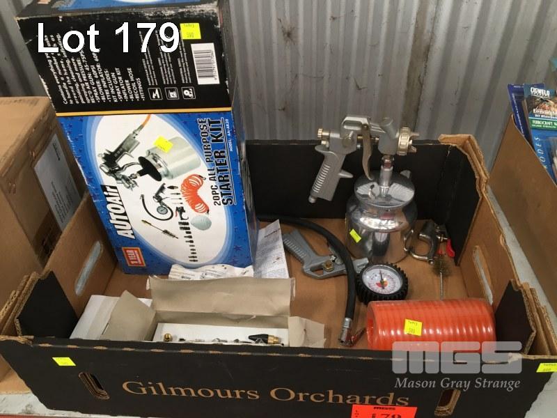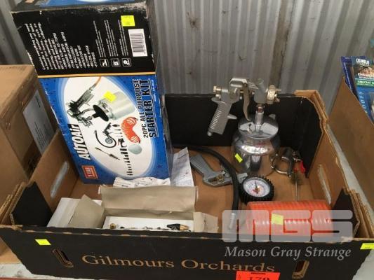 2 x PRESSURE SPRAY PAINT GUNS, 2 x TYRE INFLATORS, AIRE HOSE & ATTACHMENTS/FITTINGS, 1 x BOX