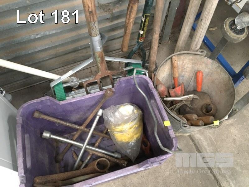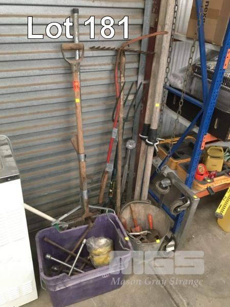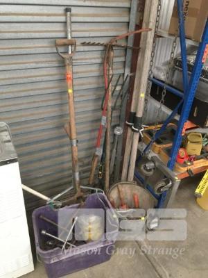 PITCH FORKS, RAKE, HOE, TROUGHS, ASSORTED TYRE IRONS, 2 x BOAT OARS, ETC
