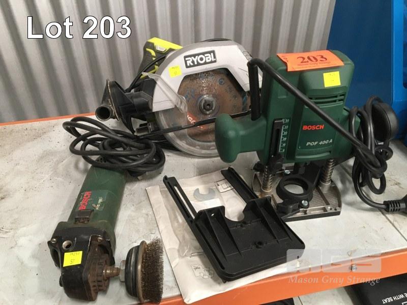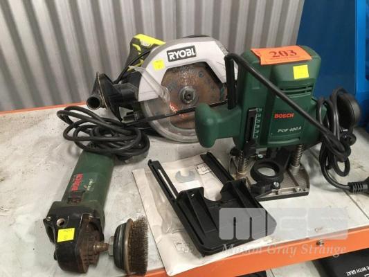 RYOBI CIRUCLAR SAW, 185mm, BOSCH GRINDER, 100mm & BOSCH PLUNGE ROUTER, ALL 240V