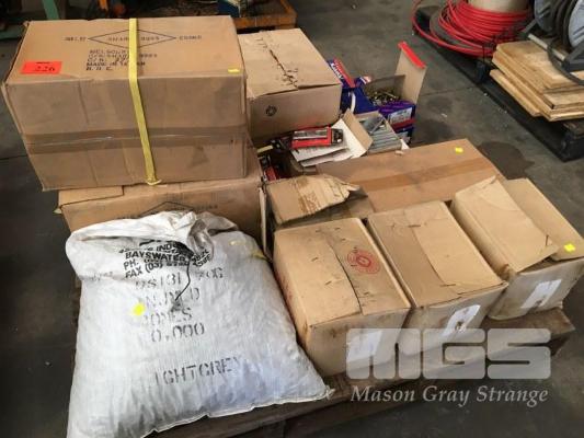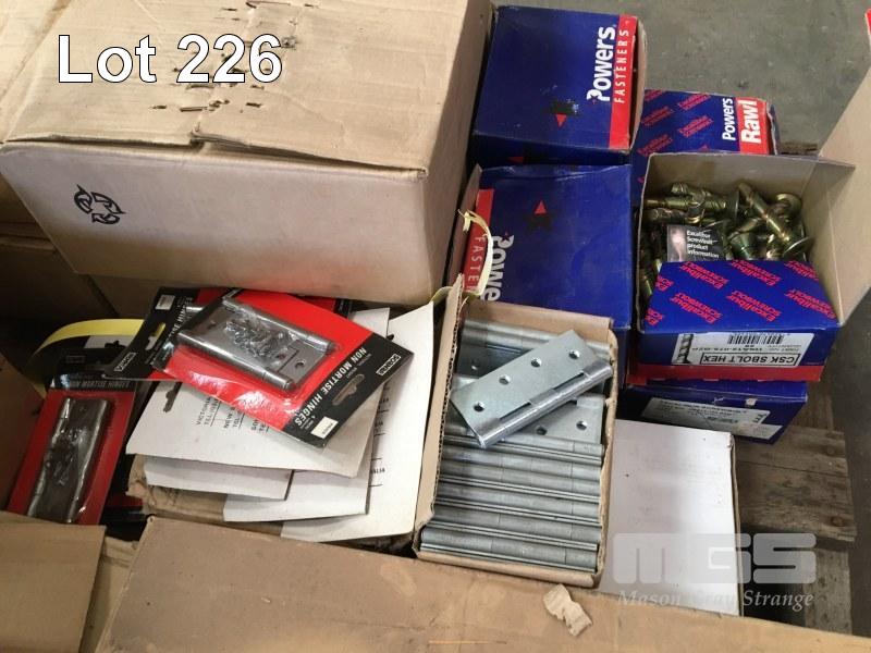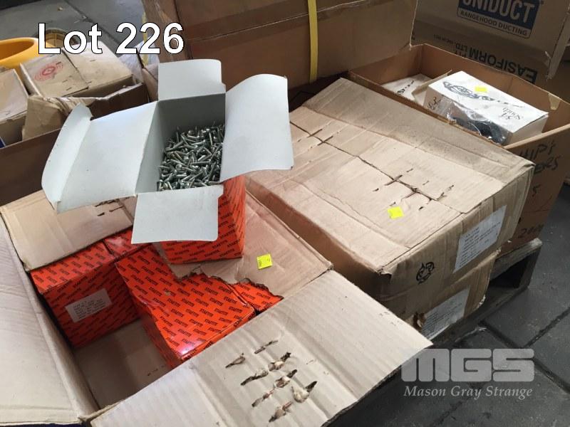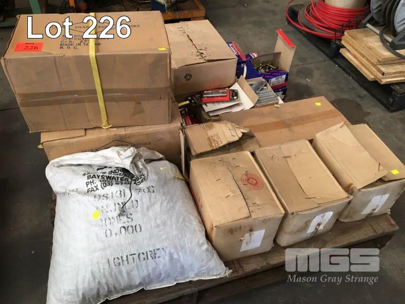 BOXES OF SCREWS, CONCRETE FASTENERS, ROOFING RUBBER WASHERS, WALL PLUGS, HINGES, ETC, 1 x PALLET