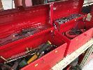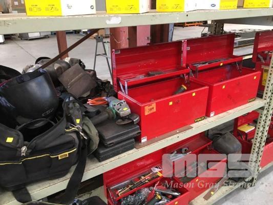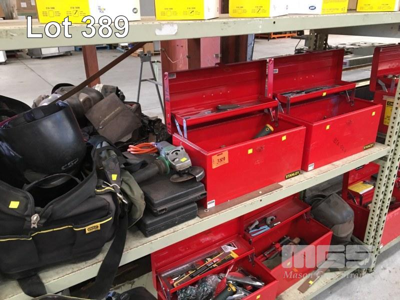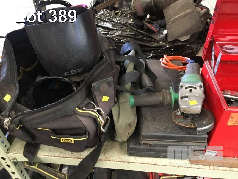 2 x TOOL BOXES & ASSORTED HAND TOOLS, HITACHI ANGLE GRINDER, DRIVER SETS & 2 x WELDING HELMETS