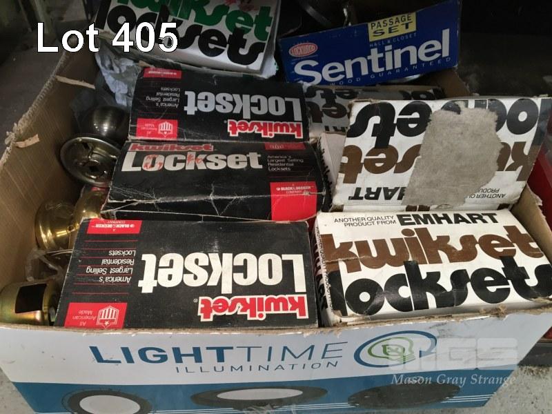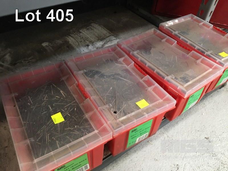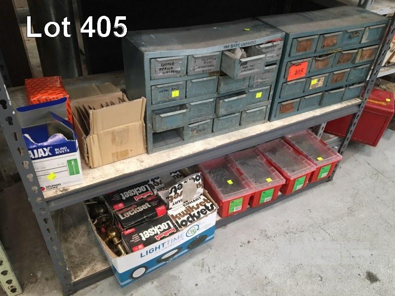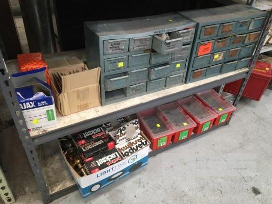 2 x STEEL MULTI DRAWER UNITS INC SPLIT PINS, TAP WASHERS, NUTS, BOLTS, ETC & 4 x BOXES BULLET HEAD NAILS, 50 X 2.8mm, DOOR HARDWARE, HINGES, ETC, 2 x SHELVES