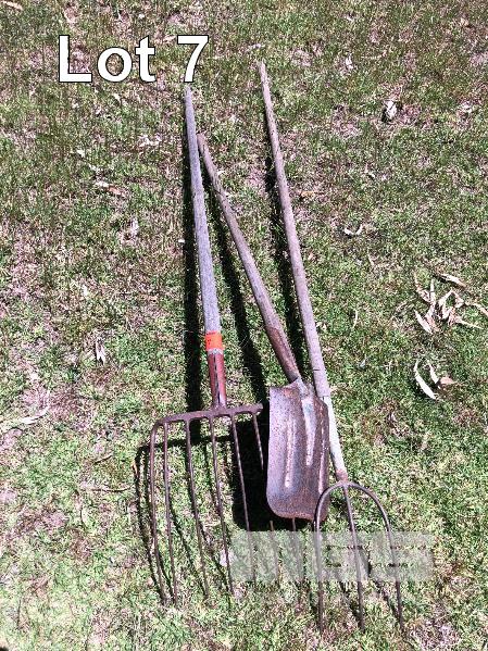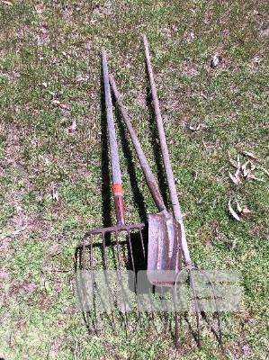 2 x HAY FORKS & 1 x LONG HANDLE SHOVEL