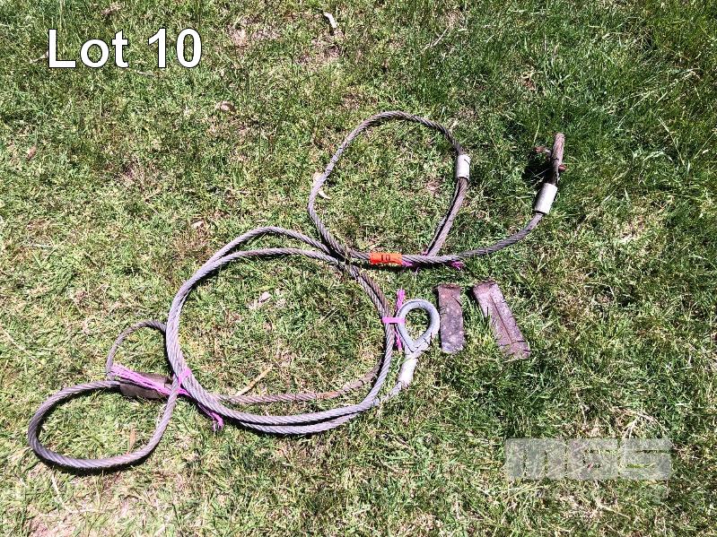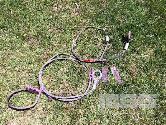 2 x HEAVY DUTY WIRE ROPES, 1 @ TREE PULLER & 1 WITH HOOK & 2 WEDGES