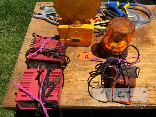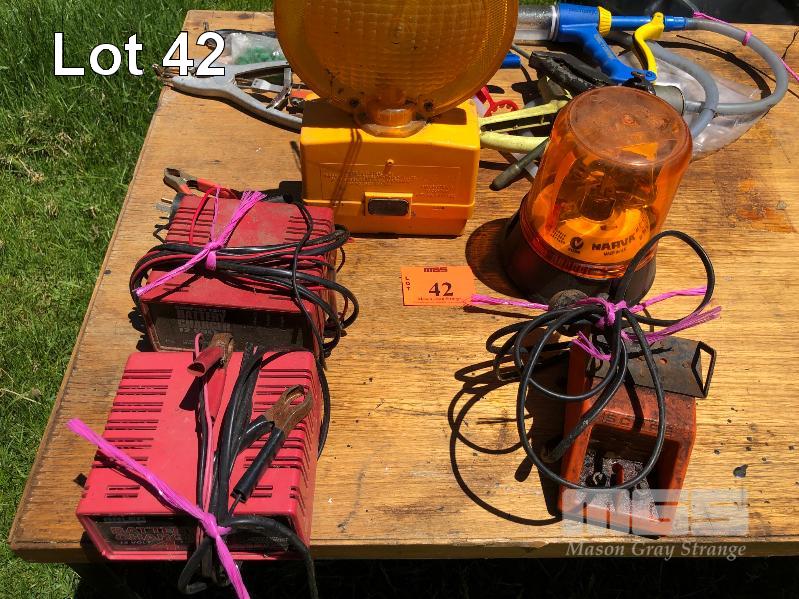 2 x 12V BATTERY CHARGERS, ARLEC, 1 x NARVA YELLOW SAFETY LIGHT, 12V, HAZARD LAMP & 240V SCOPE TRANSFORMER