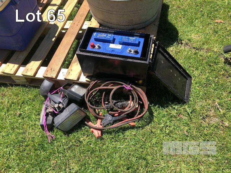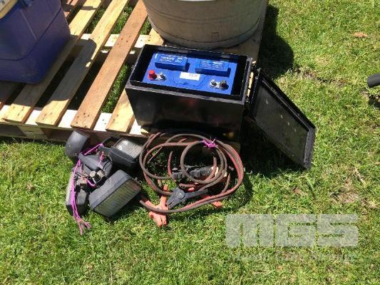 CENTURY 12V BATTERY, CCA730 MEA875, AH100, MARINE TYPE IN STEEL BATTERY BOX WITH JUMPER LEADS & 5 x TRACTOR LIGHTS