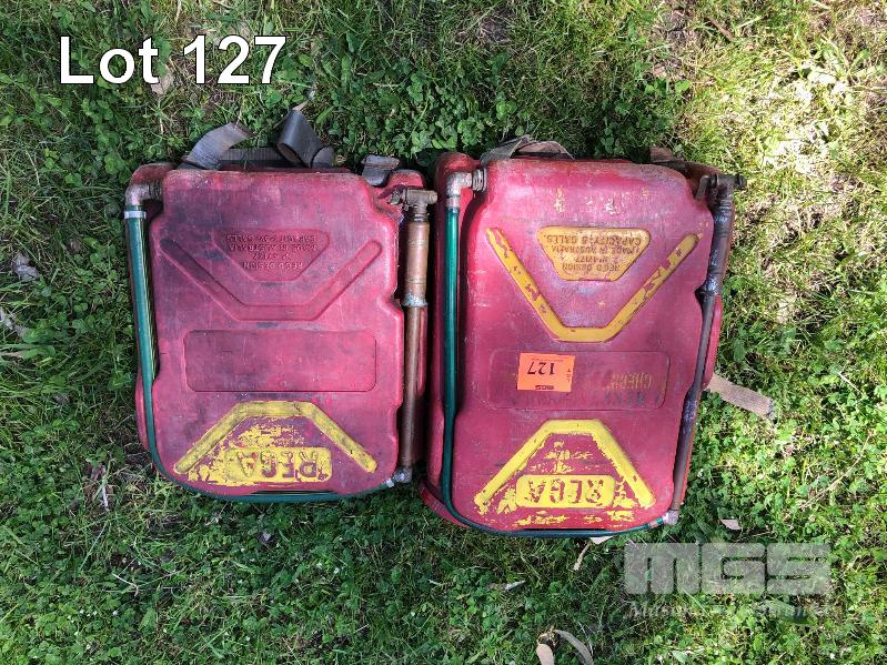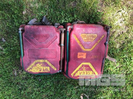 PAIR FIRE FIGHTERS BACKPACKS, 5 & 3 1/2 GALLON, HOSES & SPRAYS