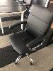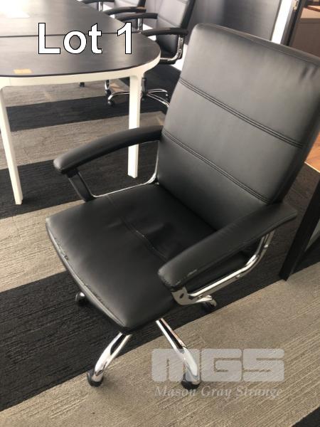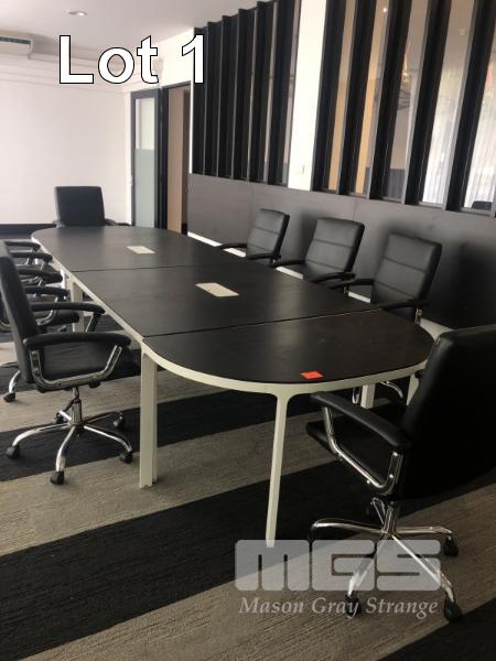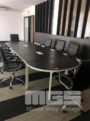 8 PIECE BOARDROOM TABLE, BLACK MATT FINISH, WITH GREY ALLOY LEGS & FRAME, SEMI CIRCLE ENDS 4200 x 1400mm WITH 6 x BLACK VINYL OFFICE CHAIRS, CHROME BASE