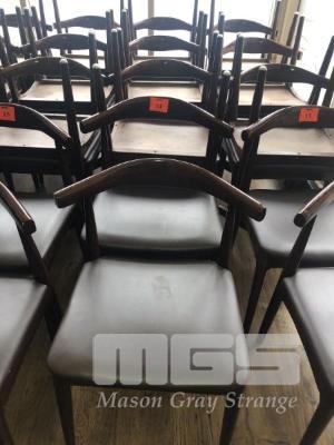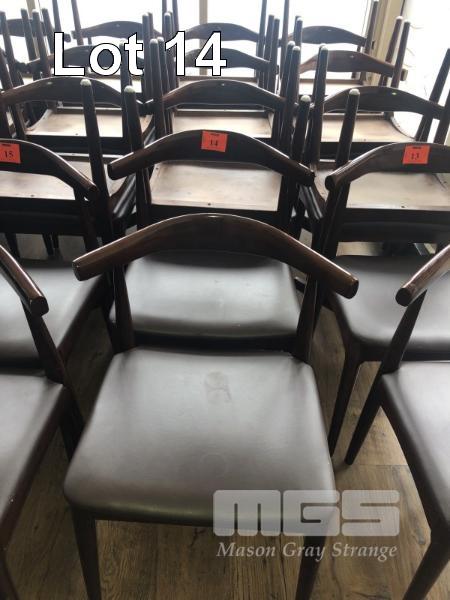 8 x TIMBER DINING ROOM CHAIRS, SWAY BACK, BROWN VINYL SEATS