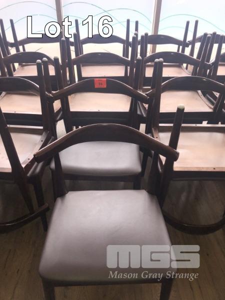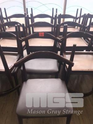 12 x TIMBER DINING ROOM CHAIRS, SWAY BACK, BROWN VINYL SEATS