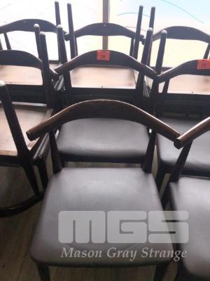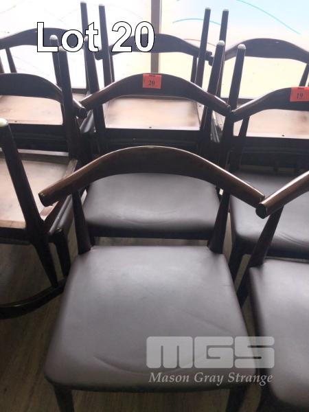 4 x TIMBER DINING ROOM CHAIRS, SWAY BACK, BROWN VINYL SEATS