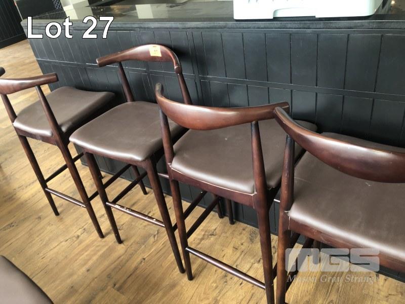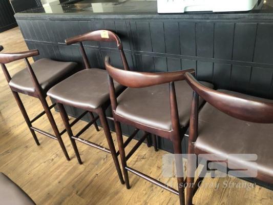 4 x TIMBER BAR STOOLS, BROWN VINYL SEATS