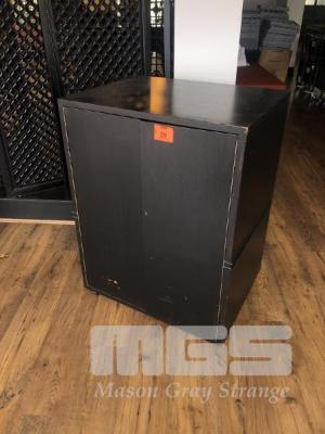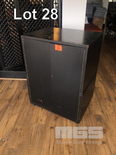 BLACK TIMBER, 2 DOOR PLATE CUPBOARD, 2 TIER, MOBILE