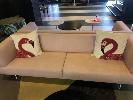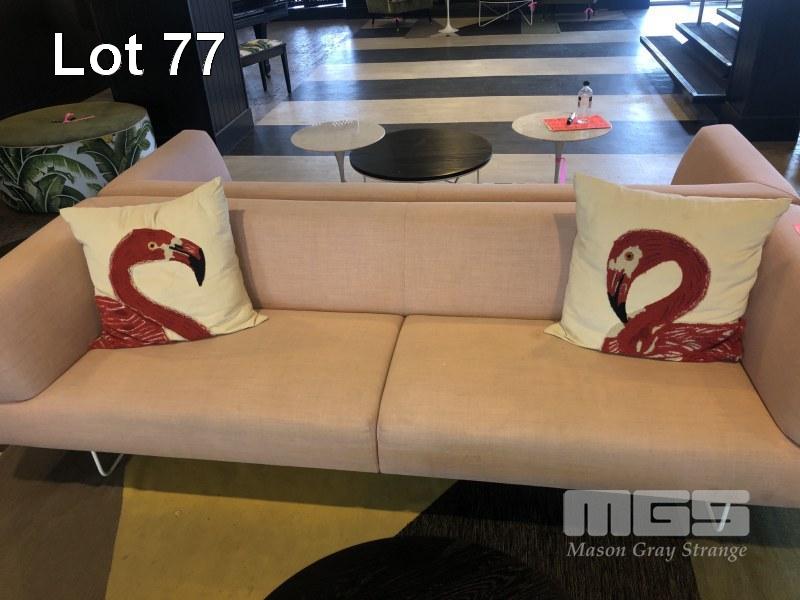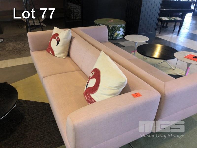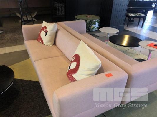 PAIR VISITORS COUCHES, 4 SEAT, PINK CLOTH, LOW BACK, 2.5m LONG