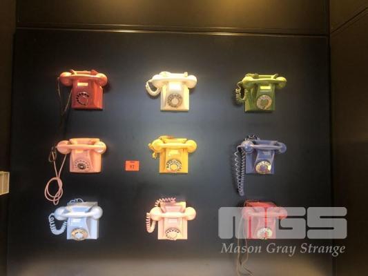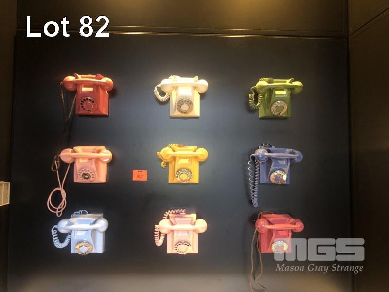 VINTAGE PHONE WALL ART, 9 OLD SCHOOL DIAL PHONES MOUNTED TO BLACK TIMBER BOARD, 1700 x 1300mm