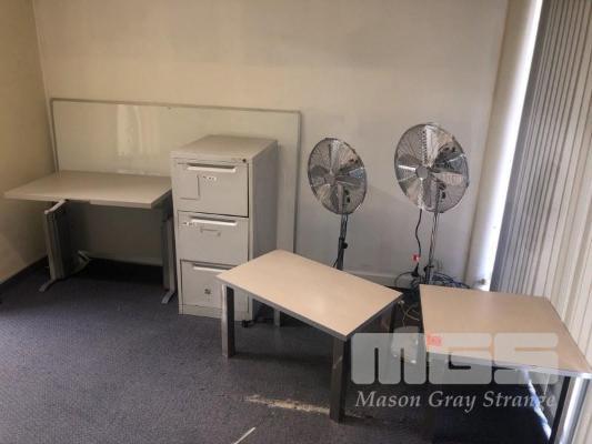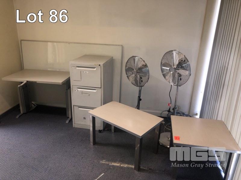 2 x PEDESTAL FANS, 2 x SMALL COFFEE TABLES, 3 DRAWER FILING CABINET, WHITE BOARD 1800 x 1200mm, ADJUSTABLE HEIGHT DESK