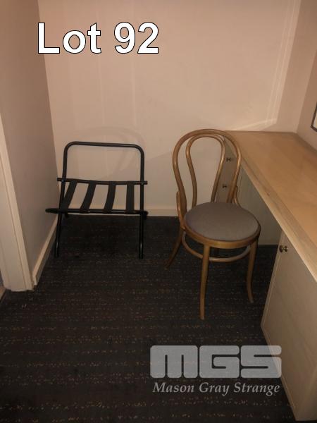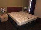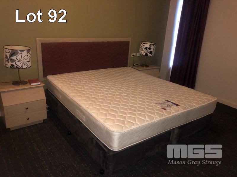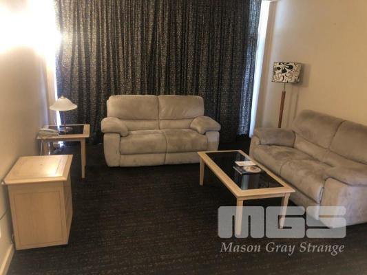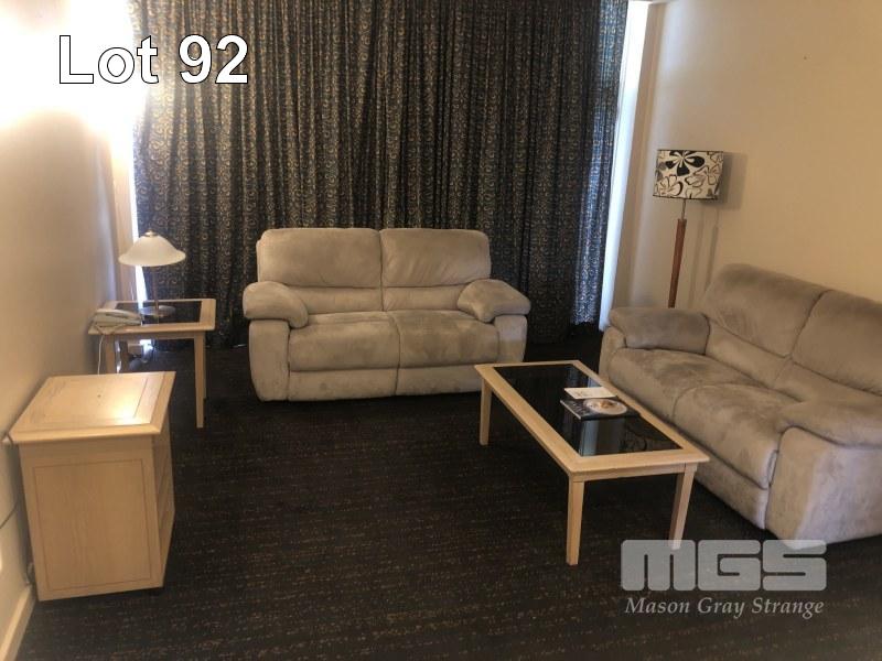 CONTENTS OF ROOM, 2 x CLOTH TWO SEATER COUCHES, WITH 2 x GLASS TOP COFFEE TABLES WITH SMALL LAMP, MATCHING TV STAND, PEDESTAL LAMP, KING SIZE BED (NOTE: TWO SINGLE SIZE BED BASES), 2 x BED SIDE TABLES WITH LAMPS, 1 x CHAIR, FOLDING LUGGAGE RACK