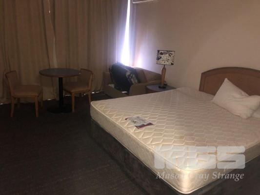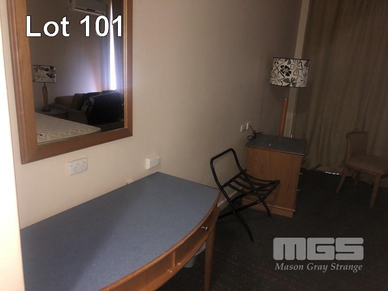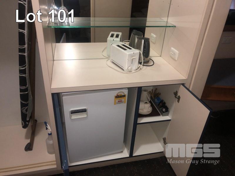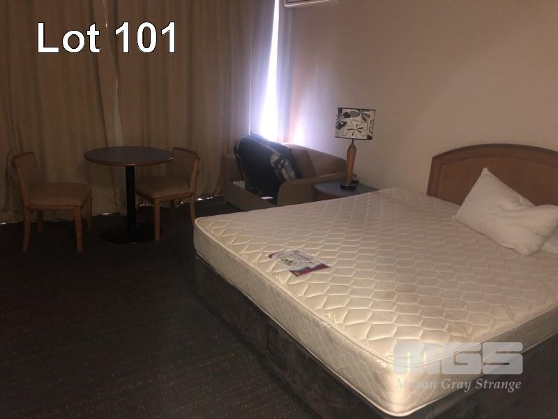 CONTENTS OF ROOM, KING SIZE ENSEMBLE (NOTE: 2 x SINGLE SIZE BED BASES) , 2 x CLOTH CHAIRS, SOFA BED, BAR FRIDGE, COFFEE TABLE, WALL MOUNT MIRROR, PEDESTAL LAMP, FOLDING LUGGAGE RACK, CURVED FRONT TIMBER DESK & MATCHING 3 DRAWER CHEST, IRONING BOARD