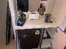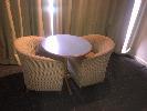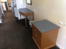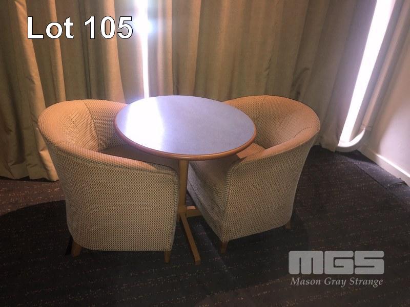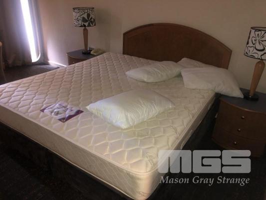 CONTENTS OF ROOM, KING SIZE ENSEMBLE (NOTE: 2 x SINGLE SIZE BED BASES) , 2 x CLOTH CHAIRS, BAR FRIDGE, COFFEE TABLE, WALL MOUNT MIRROR, PEDESTAL LAMP, FOLDING LUGGAGE RACK, CURVED FRONT TIMBER DESK & MATCHING 3 DRAWER CHEST, IRONING BOARD