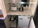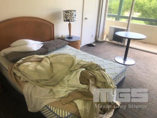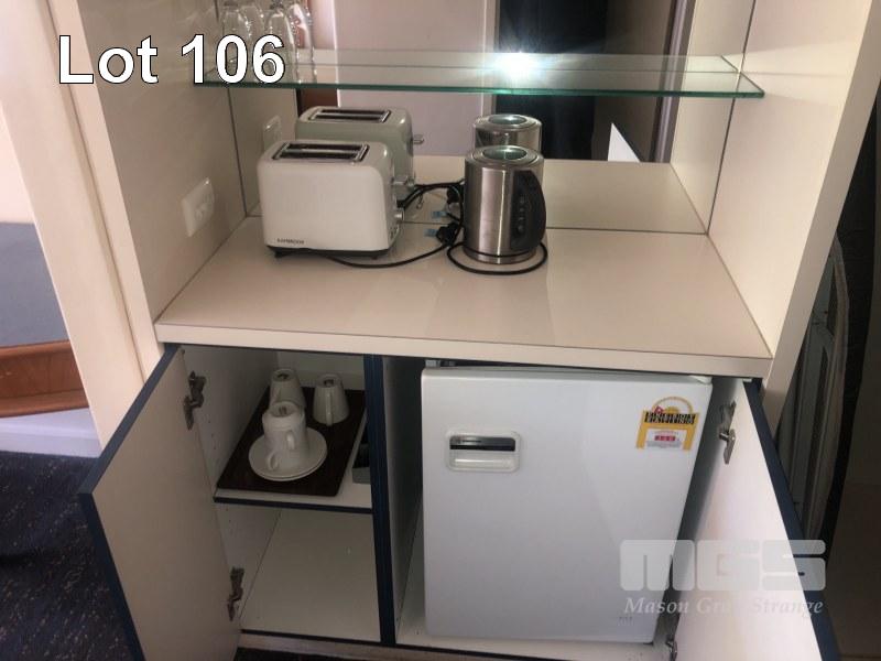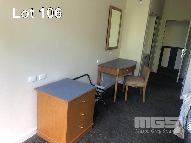 CONTENTS OF ROOM, KING SIZE ENSEMBLE (NOTE: 2 x SINGLE SIZE BED BASES) , 1 x CLOTH CHAIRS, BAR FRIDGE, COFFEE TABLE, WALL MOUNT MIRROR, FOLDING LUGGAGE RACK, 1 x CURVED FRONT TIMBER DESK & MATCHING 3 DRAWER CHEST, IRONING BOARD