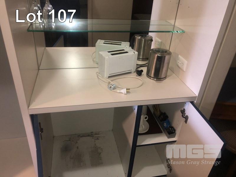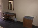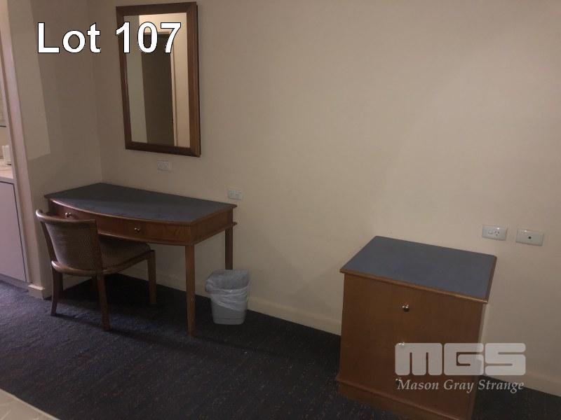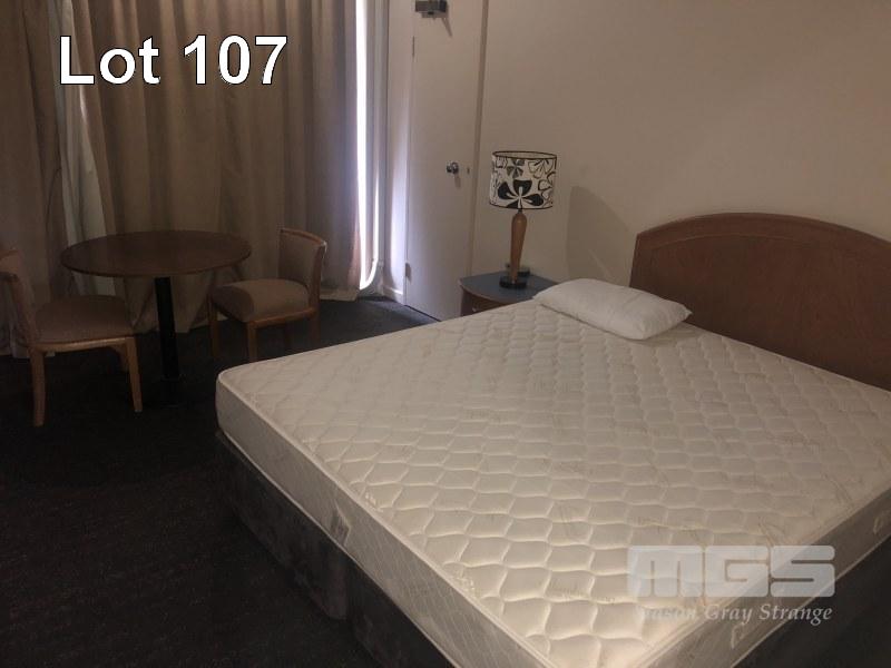 CONTENTS OF ROOM, KING SIZE ENSEMBLE (NOTE: 2 x SINGLE SIZE BED BASES) , 3 x CLOTH CHAIRS, COFFEE TABLE, WALL MOUNT MIRROR, CURVED FRONT TIMBER DESK & MATCHING 3 DRAWER CHEST, IRONING BOARD