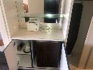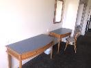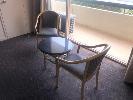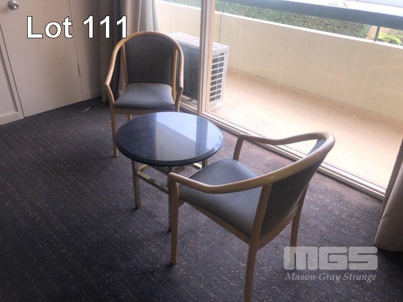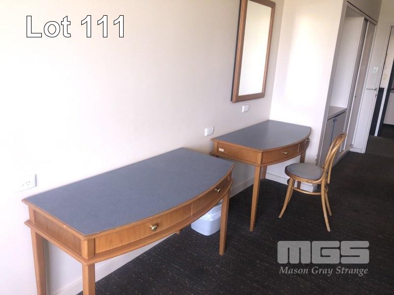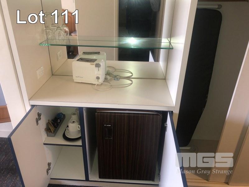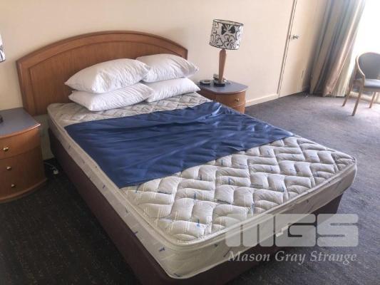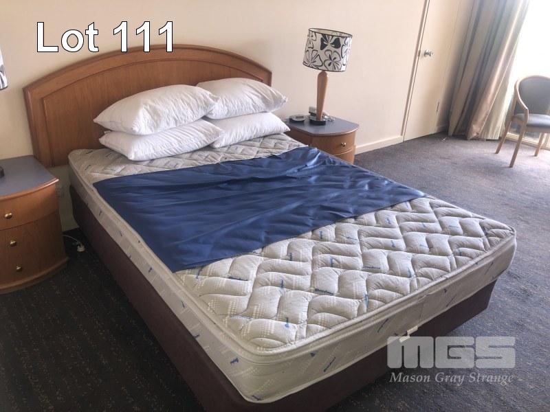 CONTENTS OF ROOM, QUEEN SIZE ENSEMBLE, BAR FRIDGE, 3 x CLOTH CHAIRS, COFFEE TABLE, PEDESTAL LAMP, WALL MOUNT MIRROR, 2 x CURVED FRONT TIMBER DESK & MATCHING 3 DRAWER CHEST, IRONING BOARD