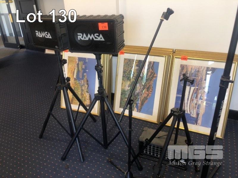 2 x RAMSA SPEAKERS ON TRIPOD STANDS, WITH CRATE PA8 AMP, MIC STAND, MUSIC STAND, TRIPOD