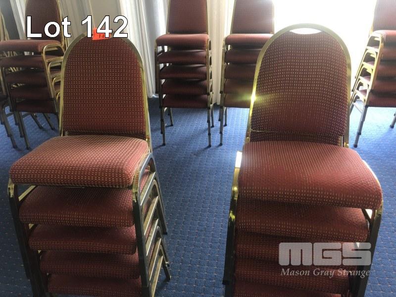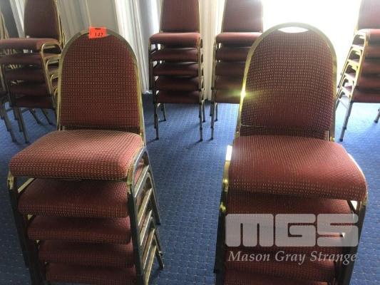 10 x STEEL FRAME DINING CHAIRS, RED PATTERN CLOTH, GOLD FRAME