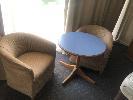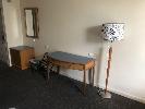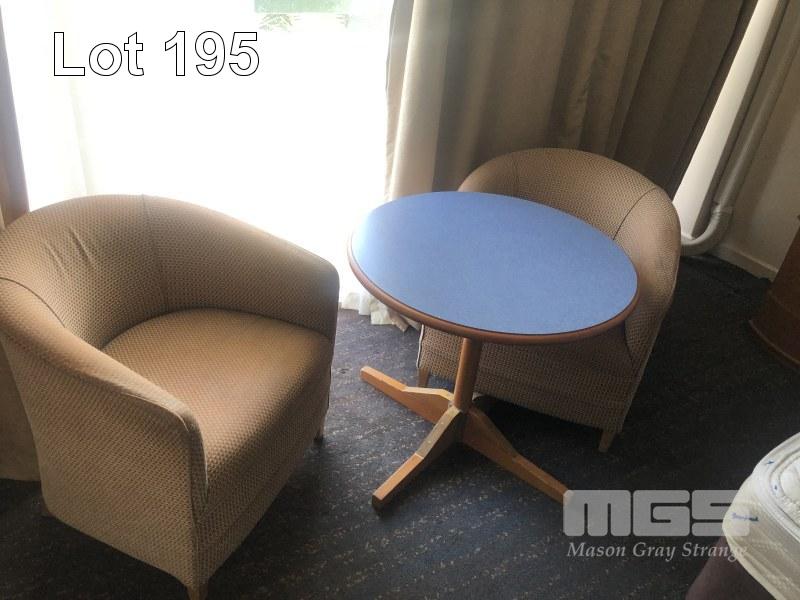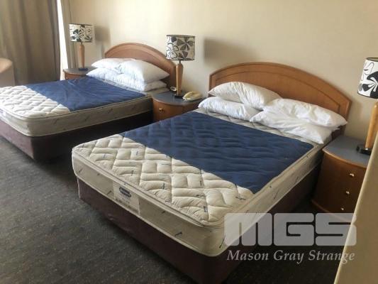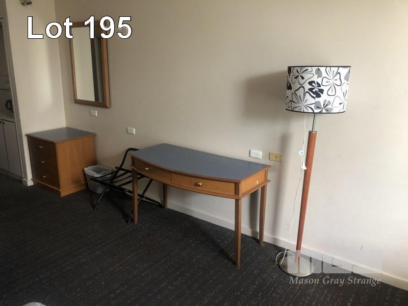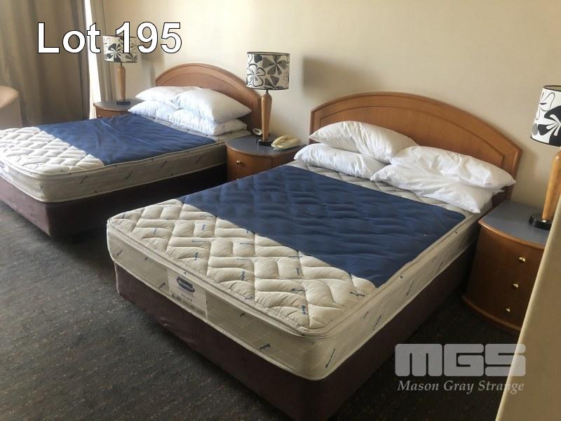 CONTENTS OF ROOM, 2 x QUEEN SIZE ENSEMBLES, BAR FRIDGE, 2 x CLOTH CHAIRS, PEDESTAL LAMP, COFFEE TABLE, PEDESTAL, WALL MOUNT MIRROR, 1 x CURVED FRONT TIMBER DESK & MATCHING 3 DRAWER CHEST, IRONING BOARD