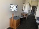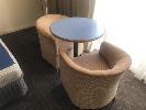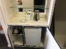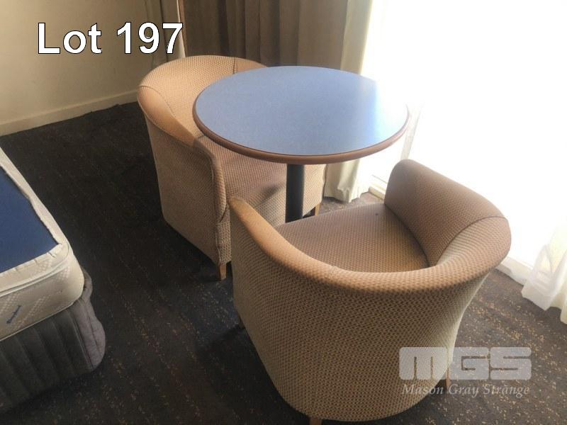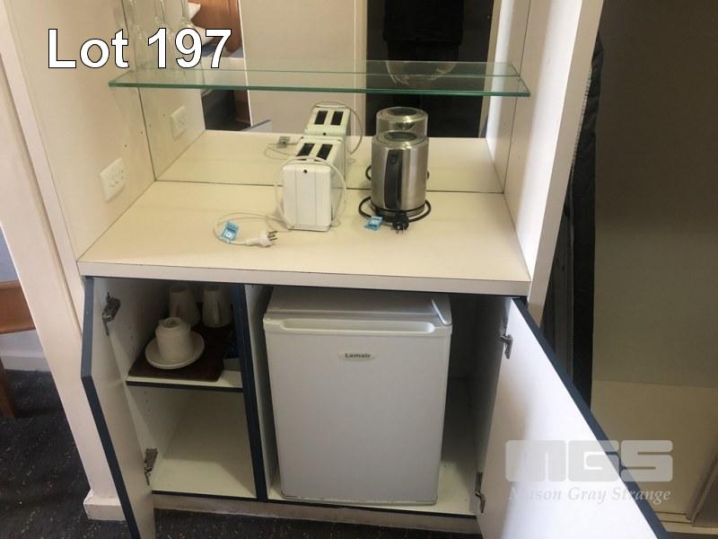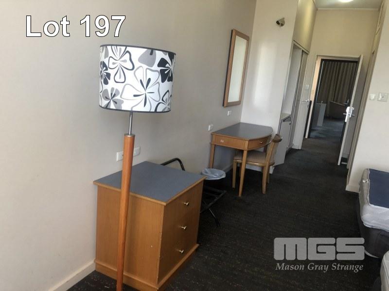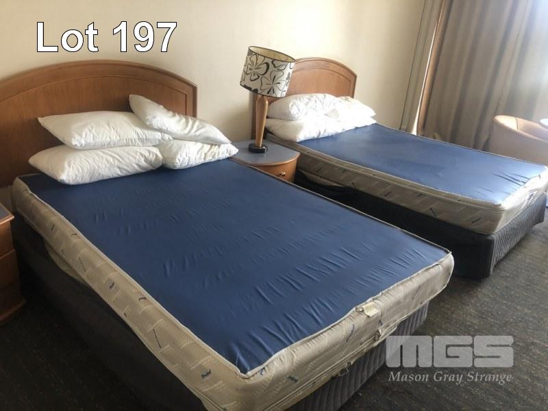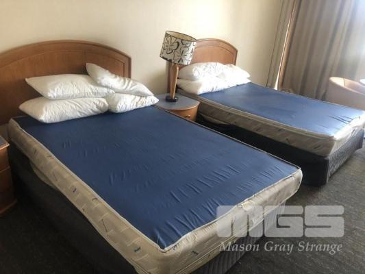 CONTENTS OF ROOM, 2 x QUEEN SIZE ENSEMBLES, BAR FRIDGE, 3 x CLOTH CHAIRS, PEDESTAL LAMP, COFFEE TABLE, PEDESTAL, WALL MOUNT MIRROR, 1 x CURVED FRONT TIMBER DESK & MATCHING 3 DRAWER CHEST, IRONING BOARD