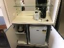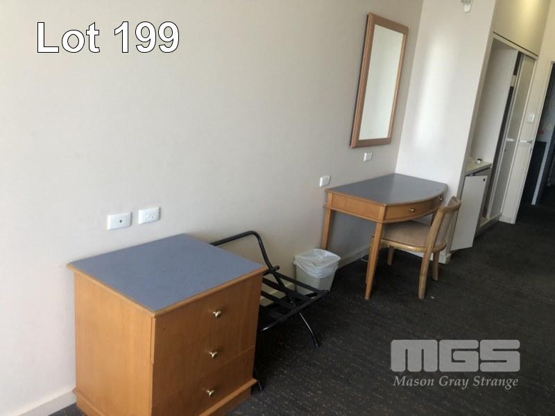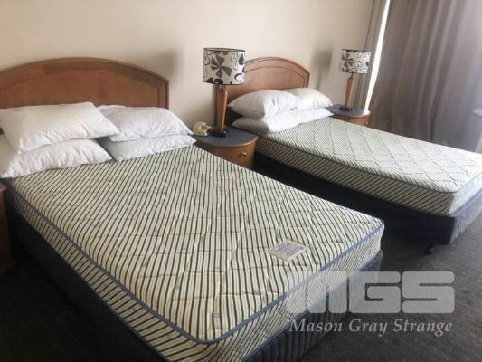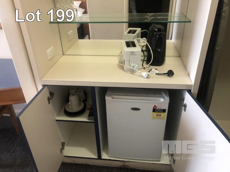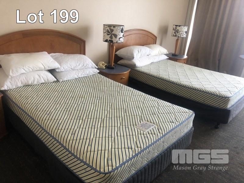 CONTENTS OF ROOM, 2 x QUEEN SIZE ENSEMBLES, BAR FRIDGE, 1 x CLOTH CHAIRS, PEDESTAL LAMP, COFFEE TABLE, PEDESTAL, WALL MOUNT MIRROR, 1 x CURVED FRONT TIMBER DESK & MATCHING 3 DRAWER CHEST, IRONING BOARD