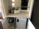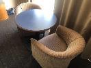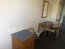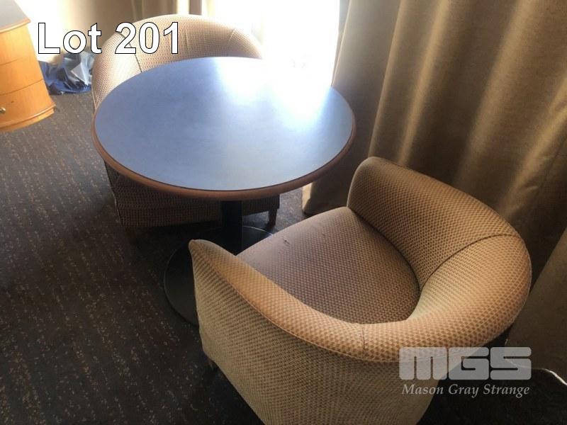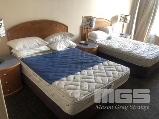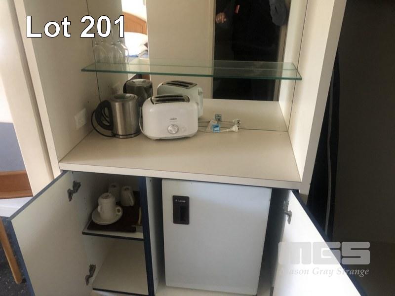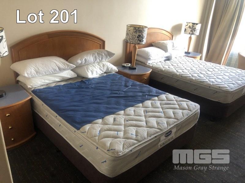 CONTENTS OF ROOM, 2 x QUEEN SIZE ENSEMBLES, BAR FRIDGE, 3 x CLOTH CHAIRS, PEDESTAL LAMP, COFFEE TABLE, PEDESTAL, WALL MOUNT MIRROR, 1 x CURVED FRONT TIMBER DESK & MATCHING 3 DRAWER CHEST, IRONING BOARD