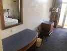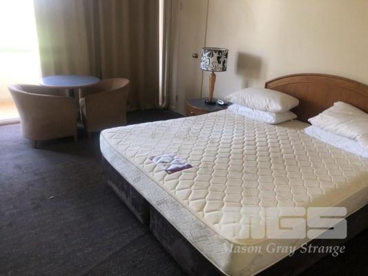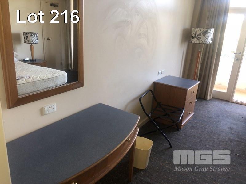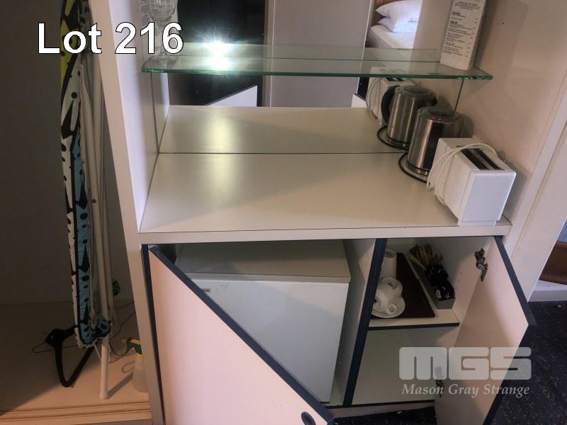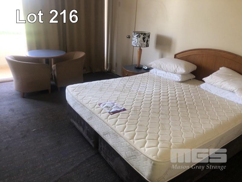 CONTENTS OF ROOM, KING SIZE ENSEMBLE, BAR FRIDGE, 2 x CLOTH CHAIRS, COFFEE TABLE, PEDESTAL LAMP, WALL MOUNT MIRROR, 1 x CURVED FRONT TIMBER DESK & MATCHING 3 DRAWER CHEST, IRONING BOARD