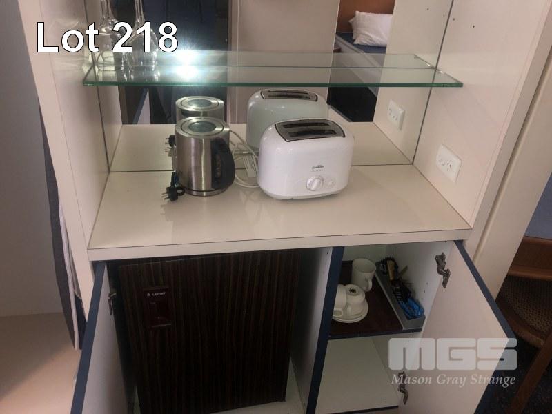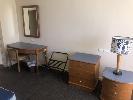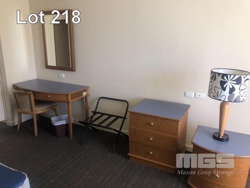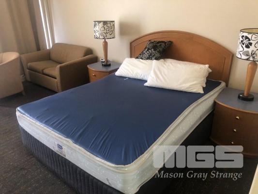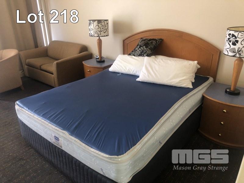 CONTENTS OF ROOM, QUEEN SIZE ENSEMBLE, SOFA BED BAR FRIDGE, 3 x CLOTH CHAIRS, COFFEE TABLE, WALL MOUNT MIRROR, 1 x CURVED FRONT TIMBER DESK & MATCHING 3 DRAWER CHEST, IRONING BOARD