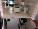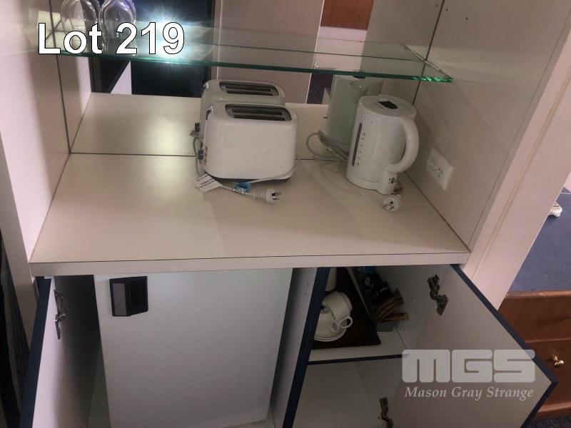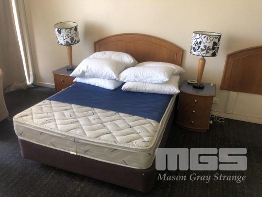CONTENTS OF ROOM, QUEEN SIZE ENSEMBLE, BAR FRIDGE, 2 x CLOTH CHAIRS, COFFEE TABLE, WALL MOUNT MIRROR, 1 x CURVED FRONT TIMBER DESK & MATCHING 3 DRAWER CHEST, IRONING BOARD, BEDSIDE CABINET
