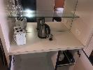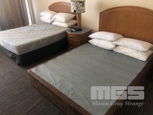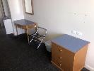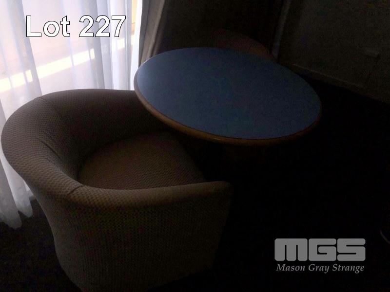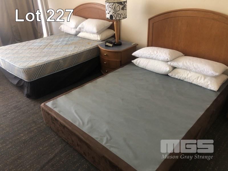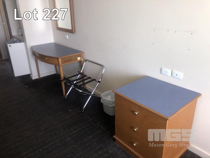 CONTENTS OF ROOM, QUEEN SIZE ENSEMBLE, 2 x CLOTH CHAIRS, COFFEE TABLE, WALL MOUNT MIRROR, 1 x CURVED FRONT TIMBER DESK & MATCHING 3 DRAWER CHEST, IRONING BOARD, BEDSIDE CABINET