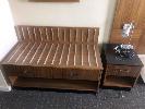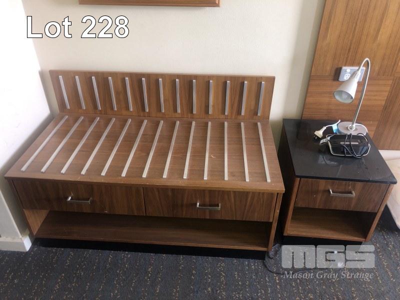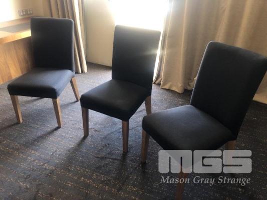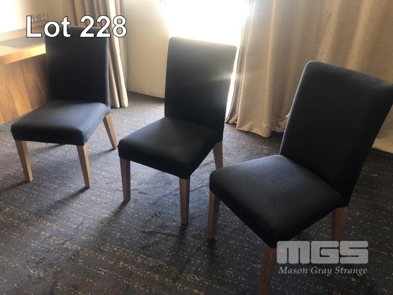 3 x BLACK CLOTH CHAIRS, 2 x BEDSIDE LAMPS, WALL MOUNT MIRROR, 2 DRAWER TIMBER LUGGAGE UNIT