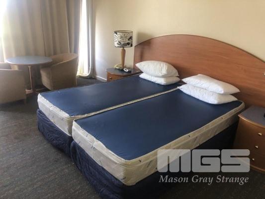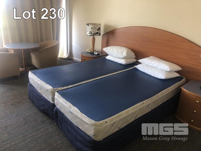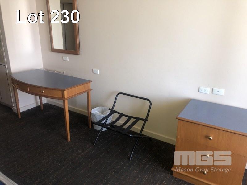 CONTENTS OF ROOM, 2 x SINGLE SIZE ENSEMBLES, 2 x CLOTH CHAIRS, COFFEE TABLE, WALL MOUNT MIRROR, 1 x CURVED FRONT TIMBER DESK & MATCHING 3 DRAWER CHEST, IRONING BOARD