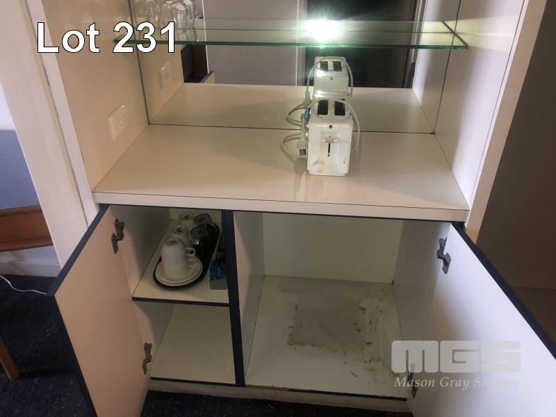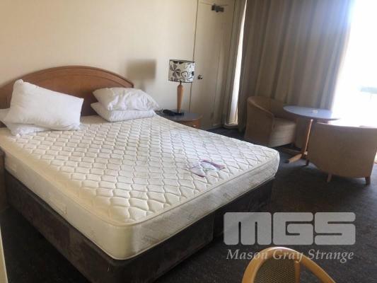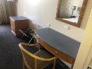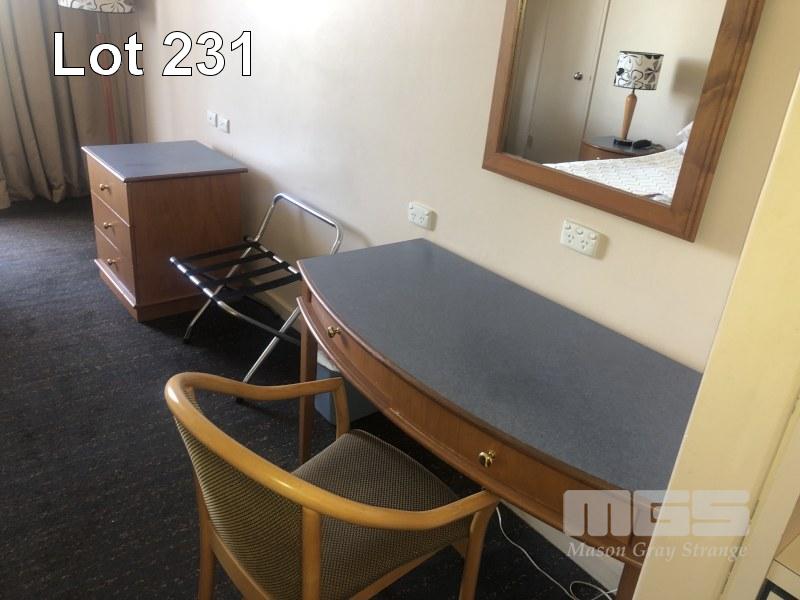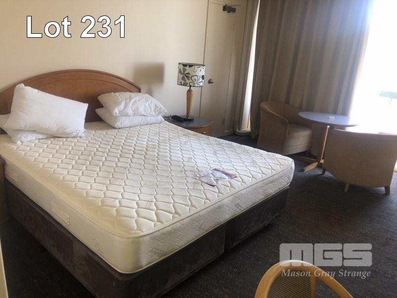 CONTENTS OF ROOM, KING SIZE ENSEMBLE, 3 x CLOTH CHAIRS, COFFEE TABLE, WALL MOUNT MIRROR, 1 x CURVED FRONT TIMBER DESK & MATCHING 3 DRAWER CHEST, IRONING BOARD, BEDSIDE CABINET