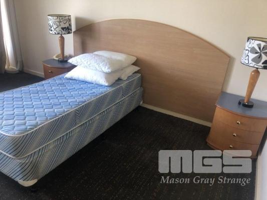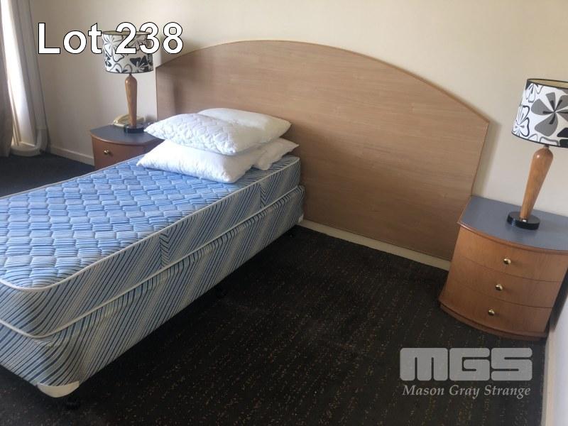 CONTENTS OF ROOM, SINGLE SIZE ENSEMBLE, 3 x CLOTH CHAIRS, COFFEE TABLE, PEDESTAL LAMP, WALL MOUNT MIRROR, 1 x CURVED FRONT TIMBER DESK & MATCHING 3 DRAWER CHEST, IRONING BOARD, BEDSIDE CABINET